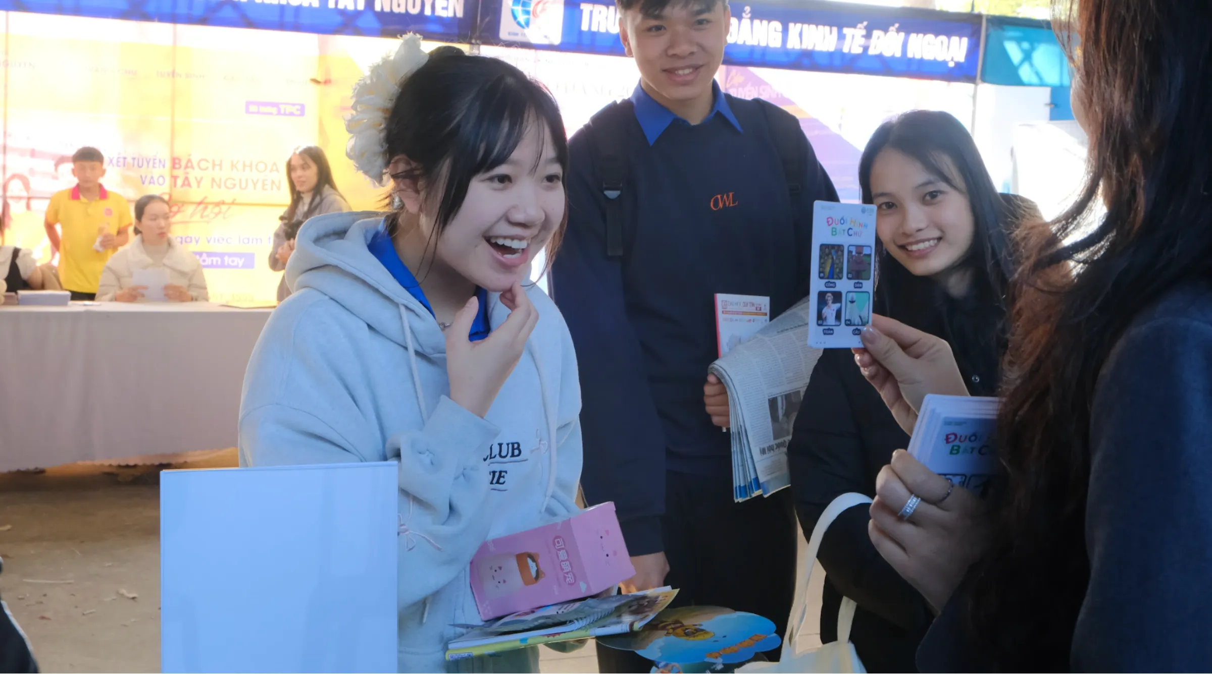 Ngay từ đầu chương trình, khu vực gian tư vấn của Asia University Vietnam đã thu hút học sinh ghé thăm, tìm hiểu thông tin và trao đổi trực tiếp. Nhiều học sinh chủ động đặt câu hỏi xoay quanh việc chọn ngành, yêu cầu năng lực và cơ hội nghề nghiệp trong tương lai, cho thấy nhu cầu tiếp cận thông tin hướng nghiệp ngày càng rõ nét, đặc biệt tại khu vực Tây Nguyên.